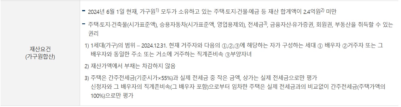 - ·(소득 · 재산요건) 2024년 부부합산 총소득이 기준금액 미만이고, 2024.6.1.기준 가구원 모두의 재산 합계액이 2.4억원 미만