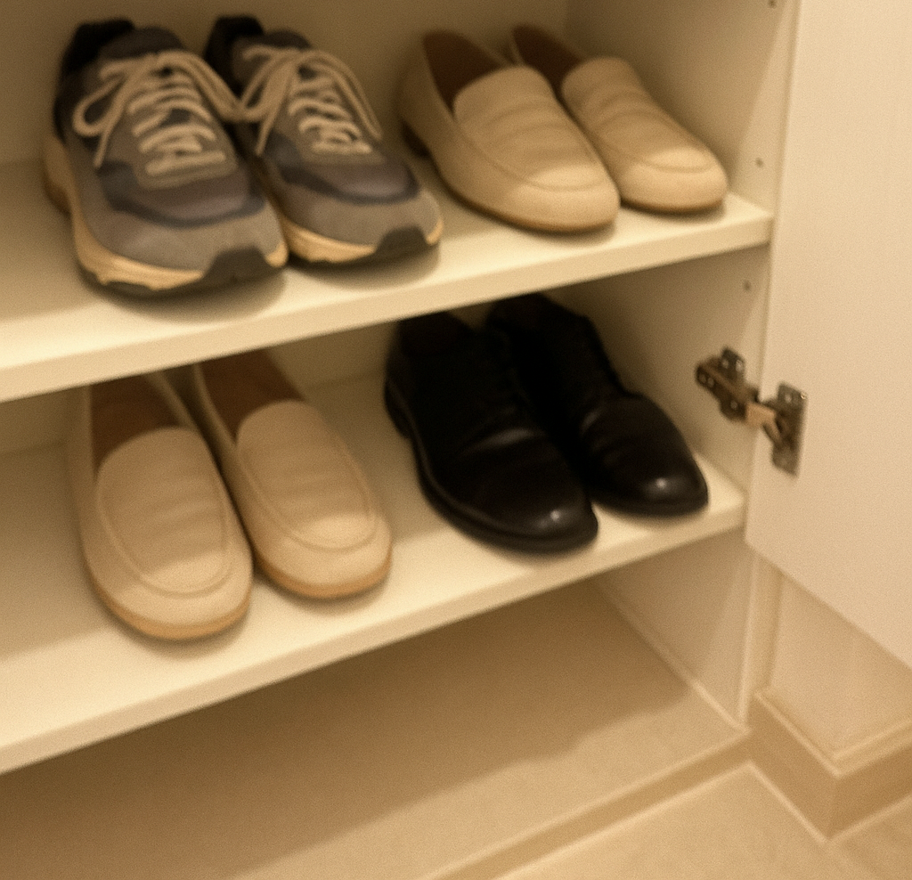 - 개방형 수납 혼합 : 자주 신는 신발 1~2켤레는 오픈랙에, 덜 신는 건 신발장 보관.