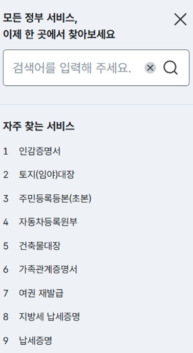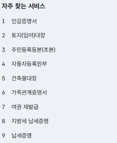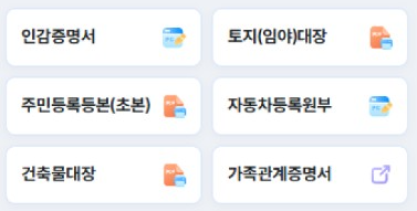 - 전자증명서 발급: 주민등록등본/초본, 가족관계증명서, 운전경력증명서 등