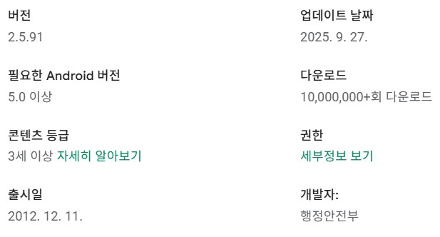 - 앱 이름이 “정부24”와 유사하지만 개발자가 행정안전부가 아니면 설치 금지